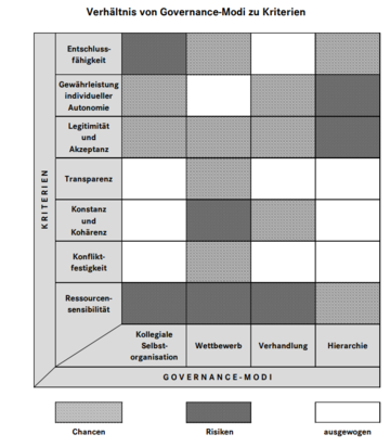Zur Beurteilung, welcher Modus für welche Art von Entscheidung eingesetzt werden soll, bietet der Wissenschaftsrat eine Systematik („Analysemodell“). Er nennt Kriterien zu Chancen und Risiken der jeweiligen Modi: