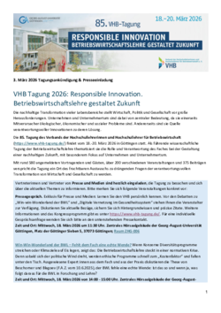 Die 85. Tagung des Verbands der Hochschullehrerinnen und Hochschullehrer für Betriebswirtschaft (https://www.vhb-tagung.de/) findet vom 18.-20. März 2026 in Göttingen statt. Als führende wissenschaftliche Tagung der Betriebswirtschaftslehre thematisiert sie die Rolle und Verantwortung des Faches bei der Gestaltung einer nachhaltigen Zukunft, mit besonderem Fokus auf Unternehmen und Unternehmertum.