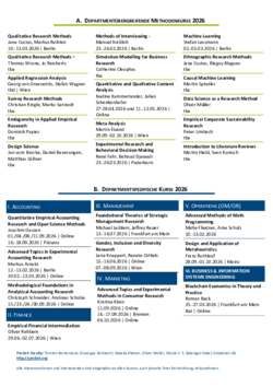 Das VHB ProDok-Angebot besteht aus bis zu 40 Kursen, die in regelmäßigem Rhythmus angeboten werden und so eine langfristige Planung ermöglichen. Die inhaltliche Gestaltung obliegt der Arbeitsgruppe ProDok-Faculty in Abstimmung mit dem Vorstand des VHB.